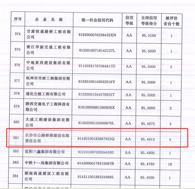 近日,交通運(yùn)輸部公布了2023年度公路建設(shè)市場全國綜合信用評價(jià)結(jié)果,在946家參評企業(yè)中,長沙路橋以95.4913分的成績脫穎而出,取得最高等級“AA”,這也是公司首次獲得該項(xiàng)榮譽(yù)。